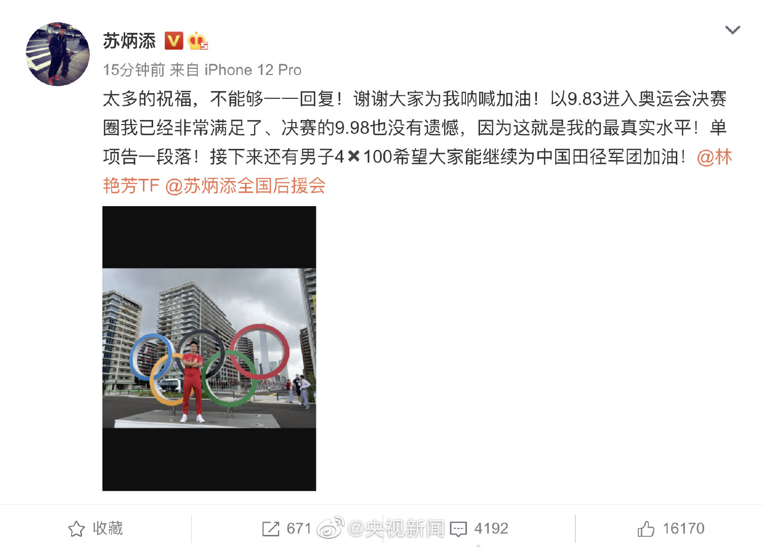 创造历史!苏炳添获得东京奥运会男子100米第六名-时政新闻-浙江在线 from china.zjol.com.cn Jun 28, 2021 · 苏炳添刚刚跑进了10秒大关。 保持健康最重要 这场在山城重庆举行的全国田径锦标赛,对于大部分获得奥运资格的选手来说,其实更像是一堂"以赛. Jun 25, 2021 · 北京时间6月24日,在2021年全国田径锦标赛暨全运会资格赛男子组100米决赛中,苏炳添起跑后选择了战略性放弃,仅以11秒50的成绩完赛。为了防止伤病影响参加东京奥运会,苏炳添将不参加本次的接力比赛。 Jun 25, 2021 · 苏炳添谢震业弃赛 接力队残阵飚到今年世界第二! 2021年06月25日 21:02 新浪体育 缩小字体 放大字体 收藏 微博 微信 分享 0